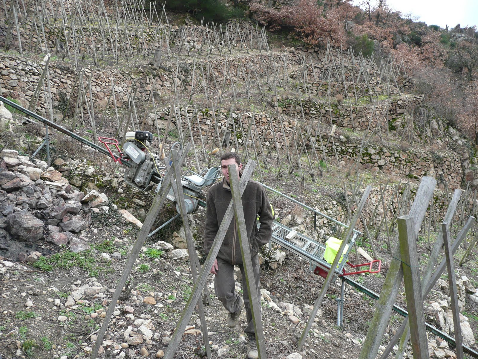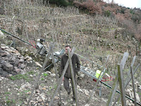 Giles talked animatedly about their new project: the Combard vineyard that they have slowly brought back from a thoroughly overgrown state. The Roman terraces has been annexed by the neighbouring forest and the clearance included the cutting down of sizeable trees. M Barge mentioned a mono-rail - the only one in Cote-Rotie - and I had visions of a Disney-style ride high above the River Rhone. An invitation did, indeed, have us riding high above the river, but with Julien on a sewing machine sized diesel engine, towing Tasting Buddy and me in a shallow wire basket up a slope that, at times, seemed to be on the cusp of becoming entirely vertical. Sitting, as I was, with my back to the slope for the upward journey, I had to wedge myself in place with locked thighs to prevent myself from dropping out of my seat onto Tasting Buddy's face thereafter to roll at high speed down to our point of origin, some hundred yards downslope. Thus by the time we climbed out of our basket at some altitude, my legs had been rendered entirely wobbly which, I found out, was not the ideal condition for legs expected to anchor one securely to an ancient and uneven Roman terrace. We sapped places for the descent.