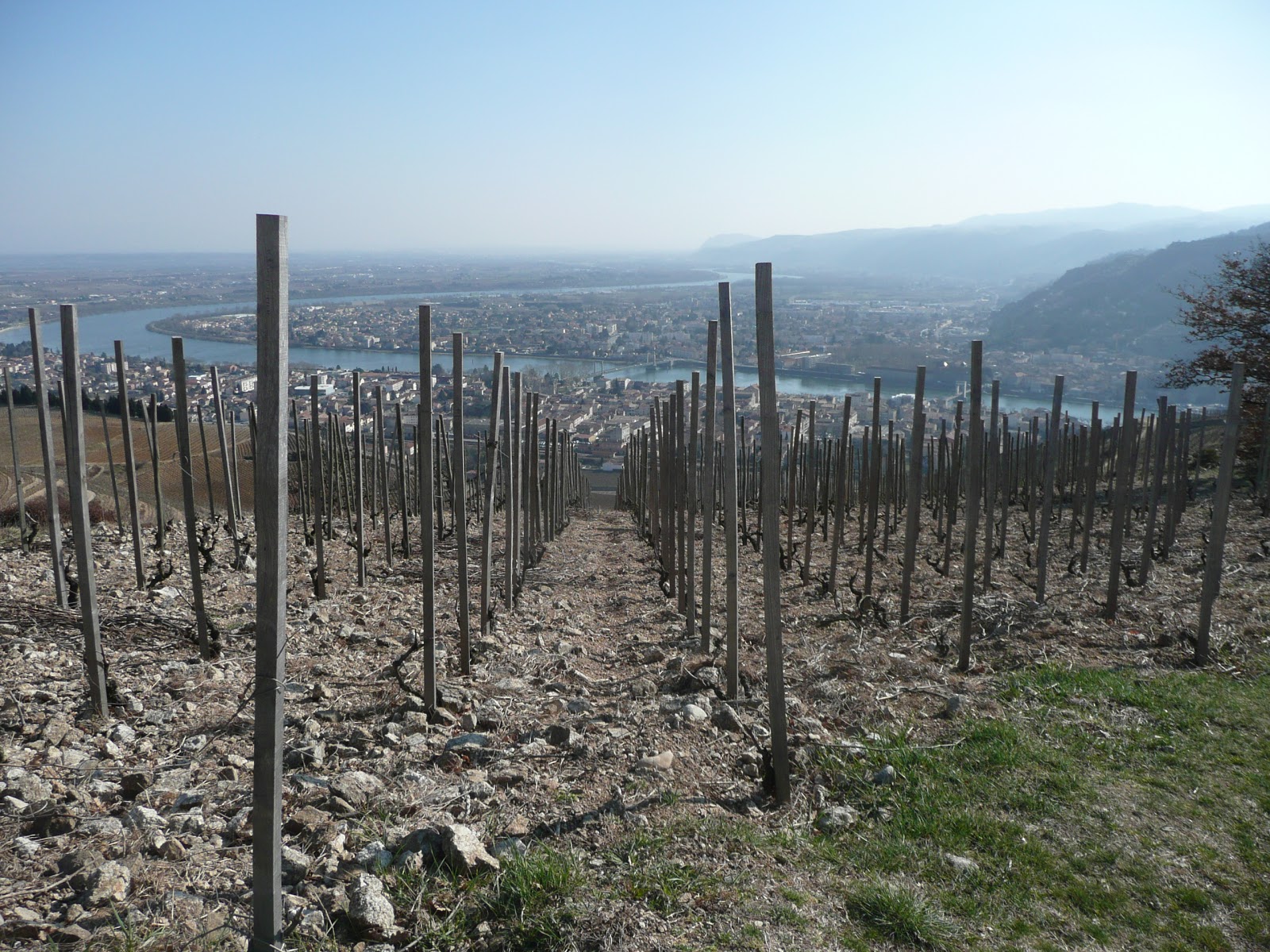 Lunch was hurriedly snaffled in Tournon, gazing out at the Hill of Hermitage. It was a rapid pitstop before heading to Mercurol, where I enjoyed a superb tasting with Emilie Desmeures, scion of the family that own Domaine des Remizieres. Lots of wine here: a "basic" Crozes-Hermitage, another, more senior cuvee, then a third - Christophe - that is given some new oak, plus the best Crozes Autrement (their super-prestige bottling) that I have ever tasted; two cuvees of white Crozes, one oaked, one not; two red Hermitages and one white. I made that eleven wines in all. I will make a selection from here. The wines are ravishing.